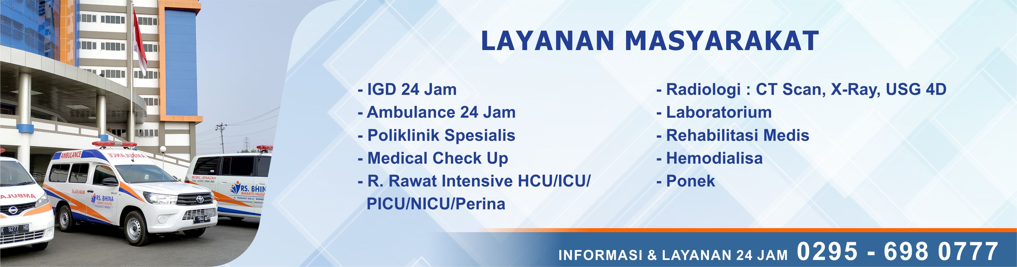Rumah Sakit Bhina Bhakti Husada memberikan pelayanan penunjang terbaik untuk pasiennya. Dilengkapi dengan peralatan dan perlengkapan yang ...
