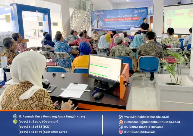 Unit Promosi Kesehatan Rumah Sakit telah mengadakan penyuluhan kesehatan "Menjaga Kesehatan di Usia Lansia" di Bank BRI Cabang Rembang pada Tanggal 16 Juli 2019. Dihadiri kurang lebih 60 peserta terdiri dari karyawan Bank BRI dan nasabah pensiunan BRI. Bertempat di Banking Hall Bank BRI Cabang Rembang, peserta yang hadir rata - rata berusia di atas 40 Tahun. Acara dimulai dari pukul 16.00 sampai dengan 18.30 WIB. Diawali dengan pemeriksaan gula darah dan tensi darah oleh perawat RS Bhina Bhakti Husada. Dilanjut pemberian materi penyuluhan, sesi tanya jawab dan pemaparan company profile rumah sakit. Materi penyuluhan disampaikan oleh dr. Zeno Aquarista Baharano selaku dokter umum RS Bhina Bhakti Husada.